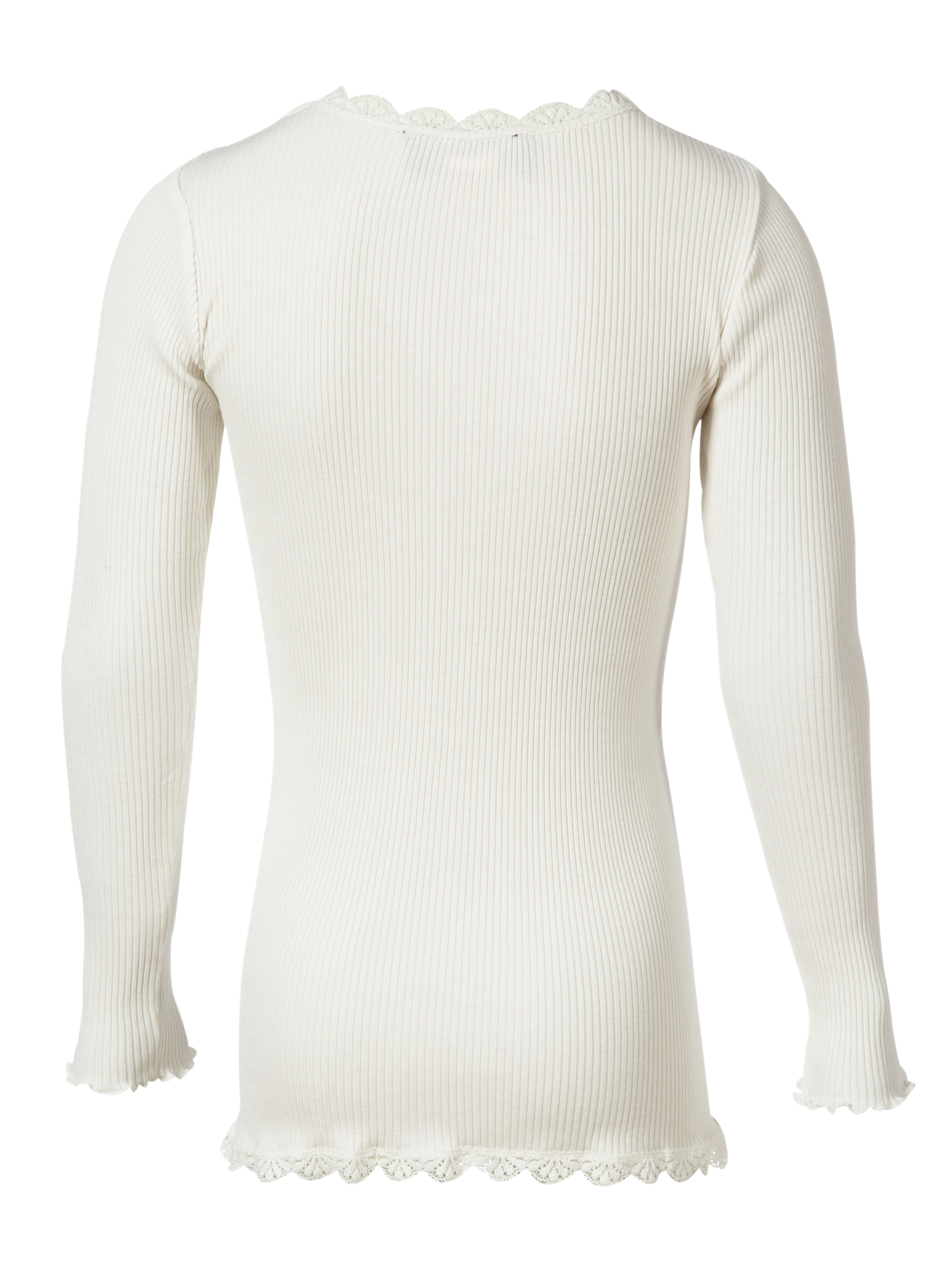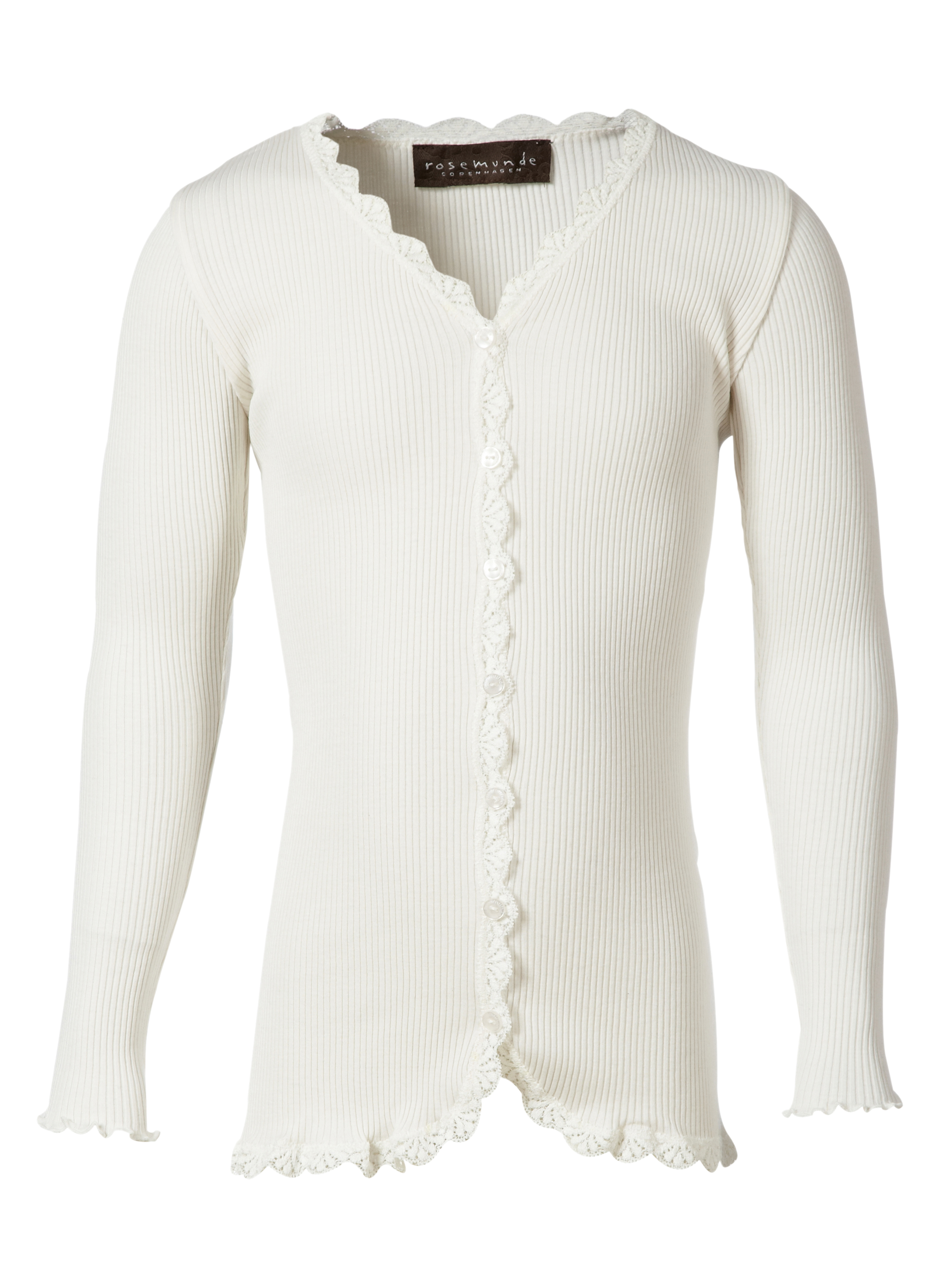 En feminin og tidløs cardigan fra Rosemunde, designet i en blød ribstrikket kvalitet, der giver et behageligt fit og et elegant udtryk. Cardiganen har lange ærmer, v-udskæring og gennemgående knaplukning foran. De fine blondekanter langs halsudskæring, knaplukning, ærmer og bund giver et delikat og romantisk touch, som kendetegner Rosemundes designunivers. Perfekt både som en let jakke over en top eller som en del af et lag-på-lag look.