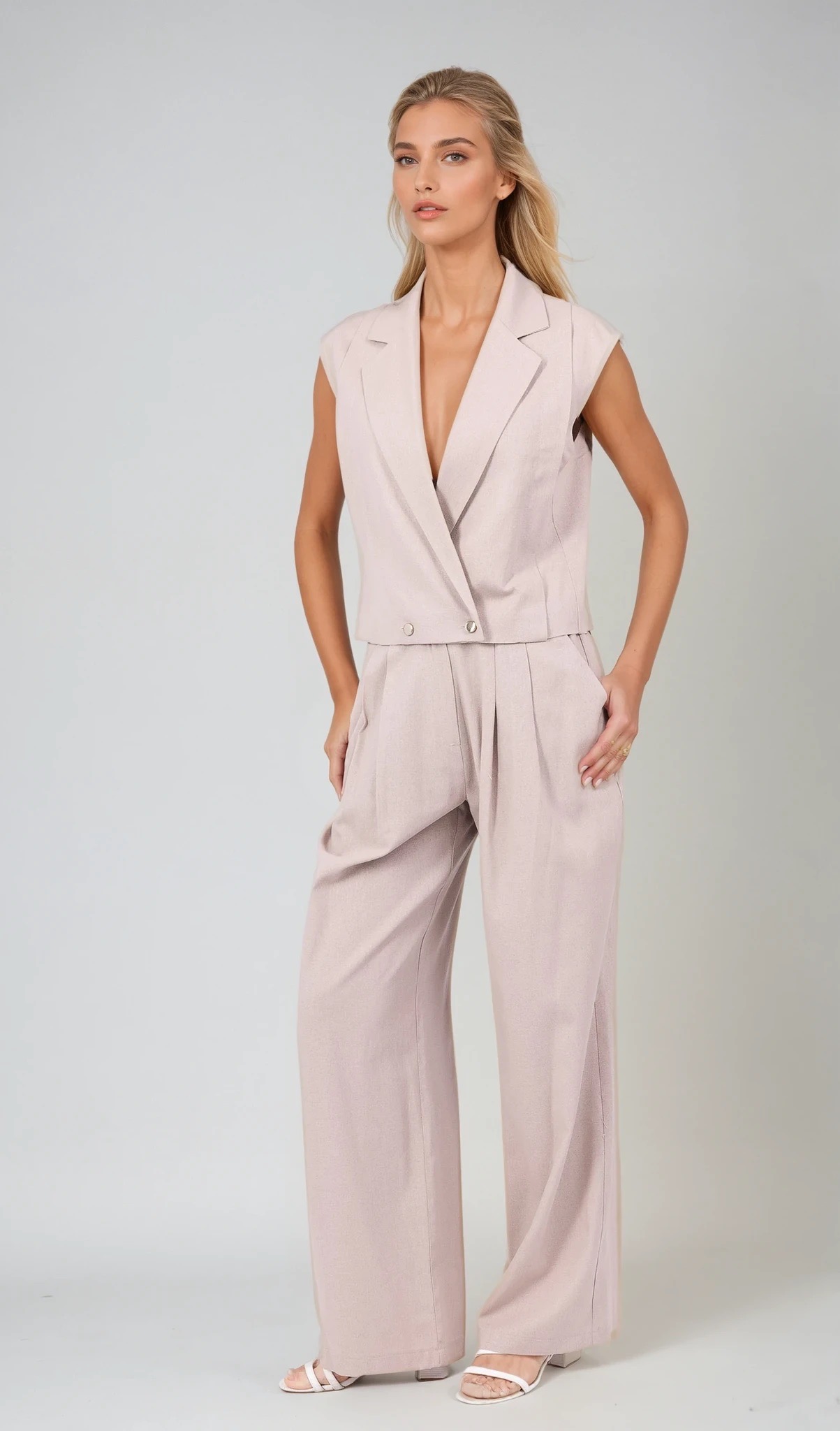 Elegant og moderne sæt fra GUAS bestående af en ærmeløs blazer-inspireret top og højtaljede, vide bukser. Sættet kombinerer klassisk skrædderlook med et feminint twist, og er perfekt til både festlige lejligheder, arbejde eller som et sofistikeret hverdagslook.