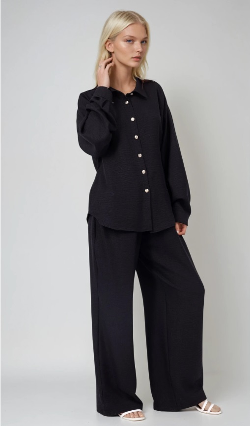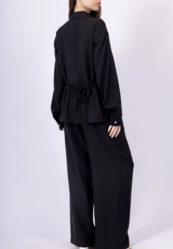 Skjorten har en løs og afslappet silhuet, der giver et sofistikeret udtryk, og bukserne er designet med vidde i benene for et moderne og behageligt fit.
