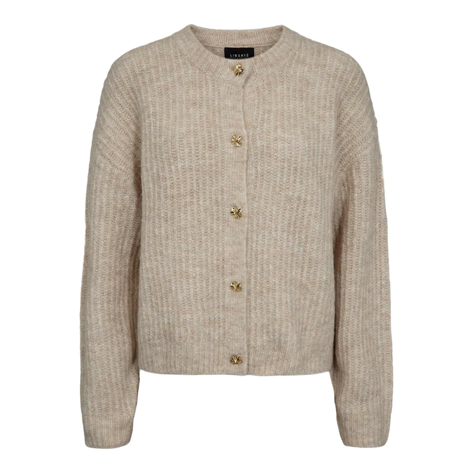 En blød og stilfuld cardigan fra Liberté, der kombinerer komfort med feminine detaljer. Cardiganen har et klassisk ribstrikket design og smukke blomsterformede knapper, som giver et elegant touch. Den er perfekt til både hverdagsbrug og til at pifte et outfit op på kølige dage.
